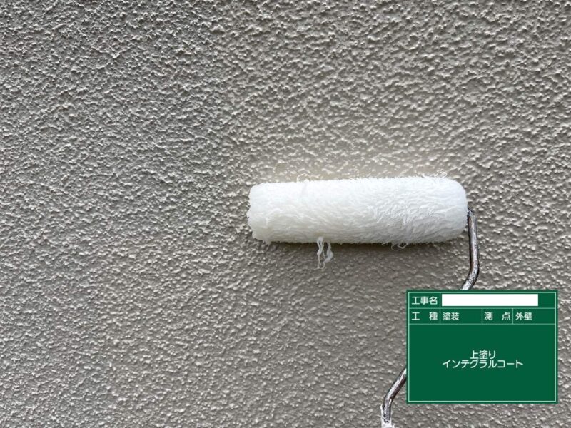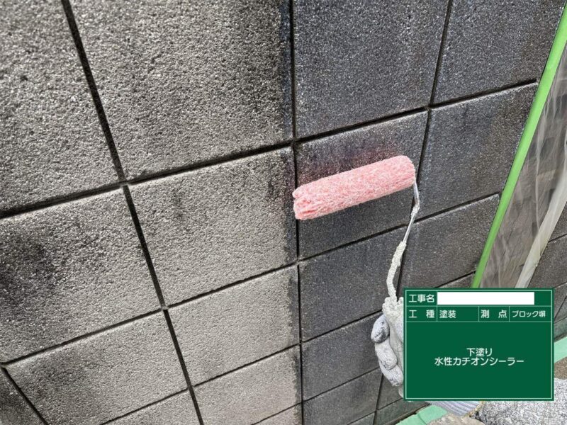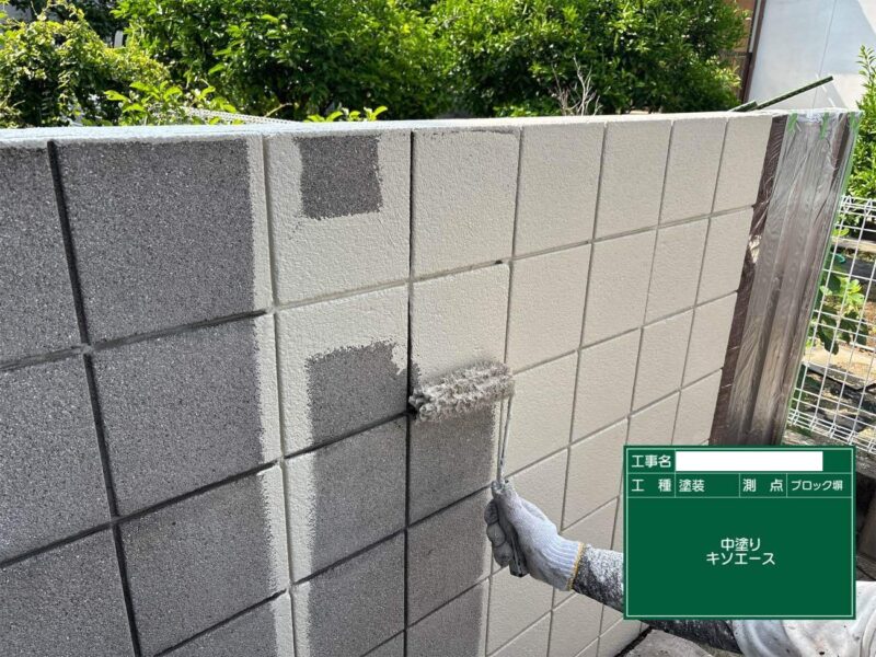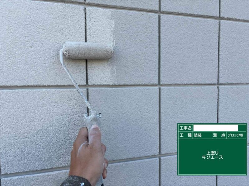 【上塗り】中塗りと同じ塗料で仕上げていきます。狭い隙間などは、小さいローラーや刷毛が入る部分は塗装していきます。塀はこれで完了です。