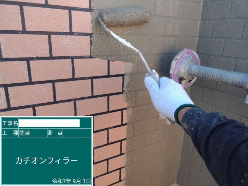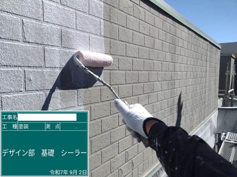 【下塗り】デザイン面の下塗りに、まずカチオンフィラーを塗布します。外壁塗装