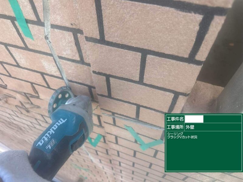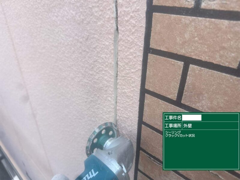 【クラックVカット】V型の歯を取り付けたサンダーで削っていきます。外壁補修