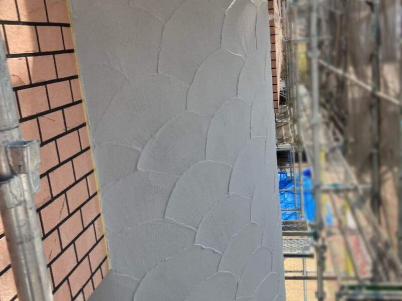 【アール部・仕上げ】連波という扇形のパターンで仕上げます。左官工事はこれで完了です。外壁塗装