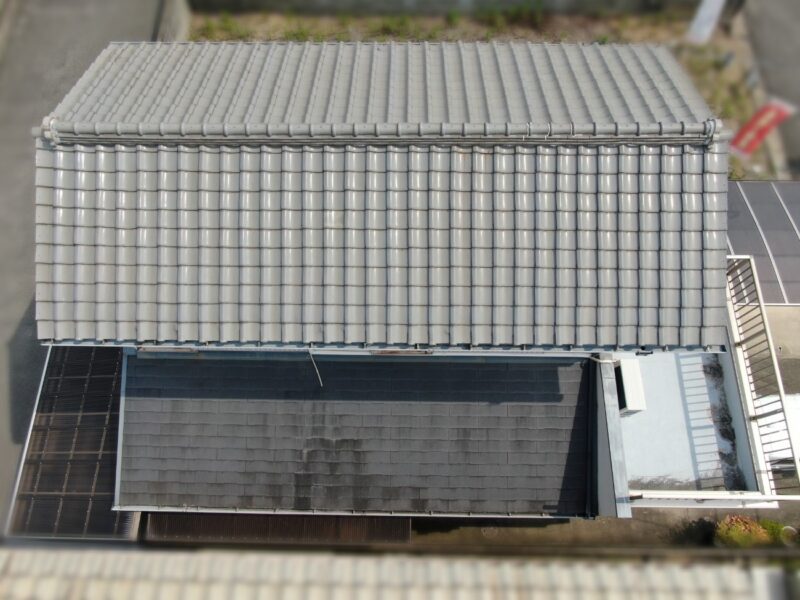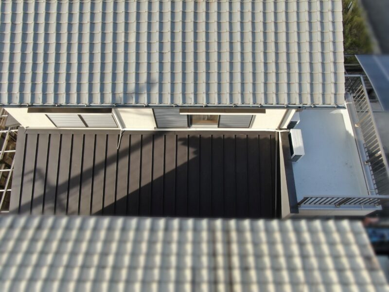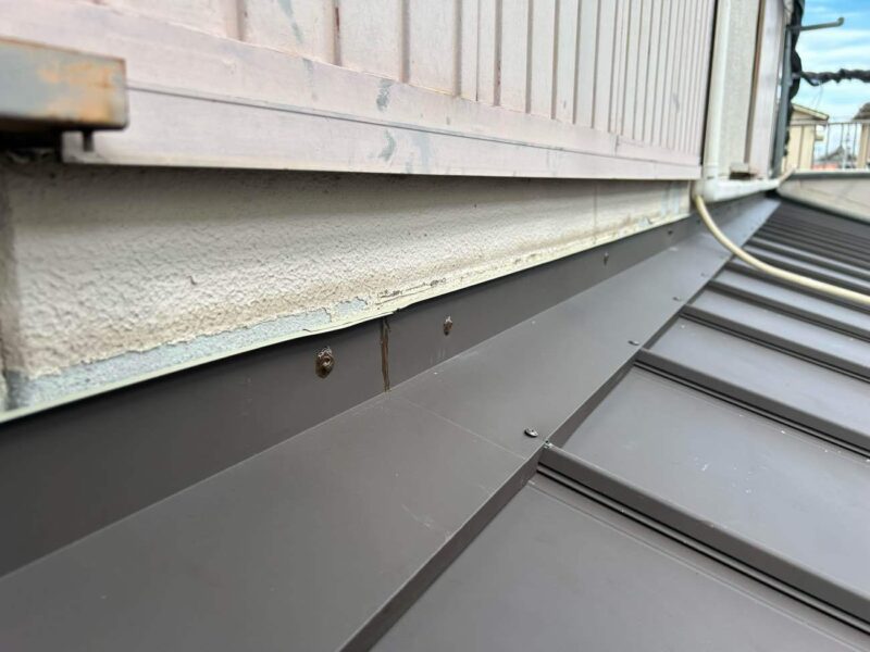【壁際水切設置】外壁と下屋との取り合いに取り付けて、外壁や屋根を伝ってきた雨水が内部に浸入するのを防ぎます。これで下屋根カバー工法は完了です。