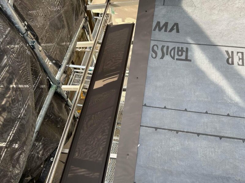 【軒先水切設置】次に、軒先水切を設置します。