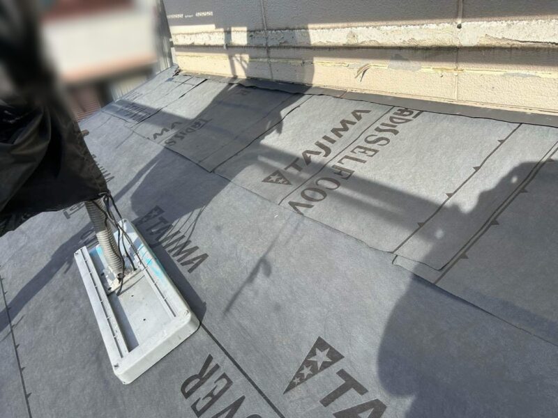 【ルーフィングシート張り】屋内に雨水を侵入させないようにするために、ルーフィングシートを貼ります。