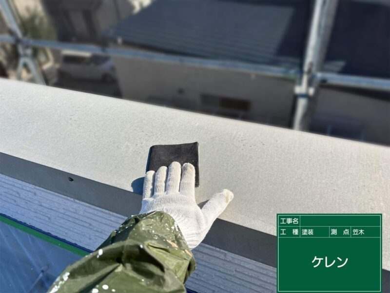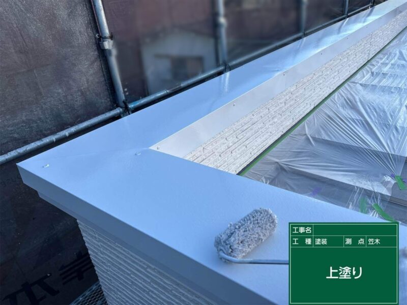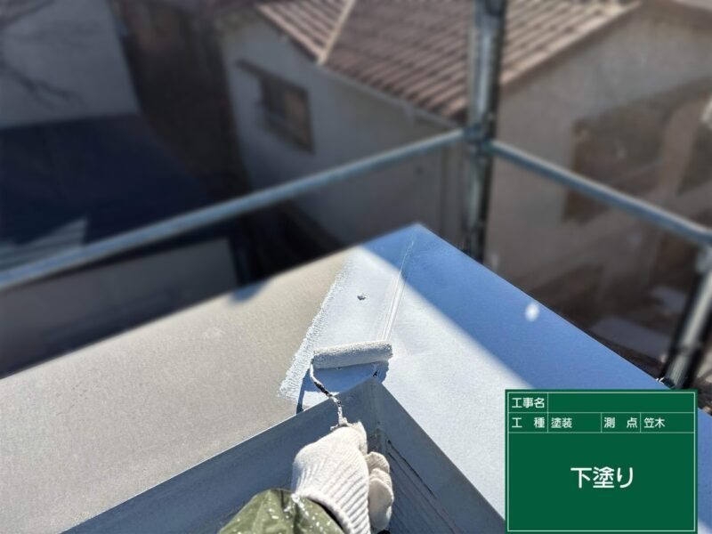 【笠木】下塗りです。鉄部分の下塗りは錆止め塗装をします。