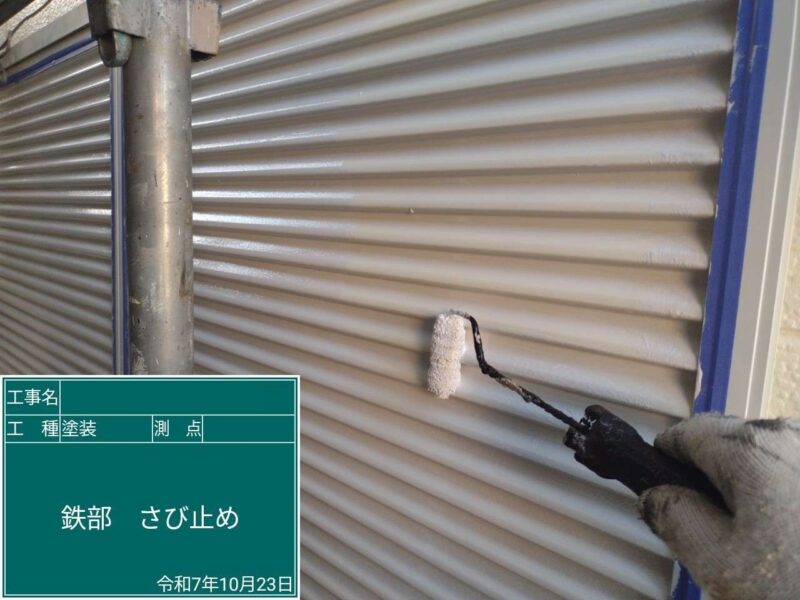 【雨戸】下塗りです。鉄部分の下塗りは錆止め塗装をします。