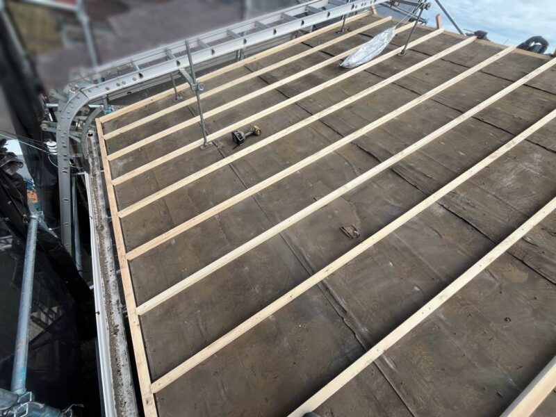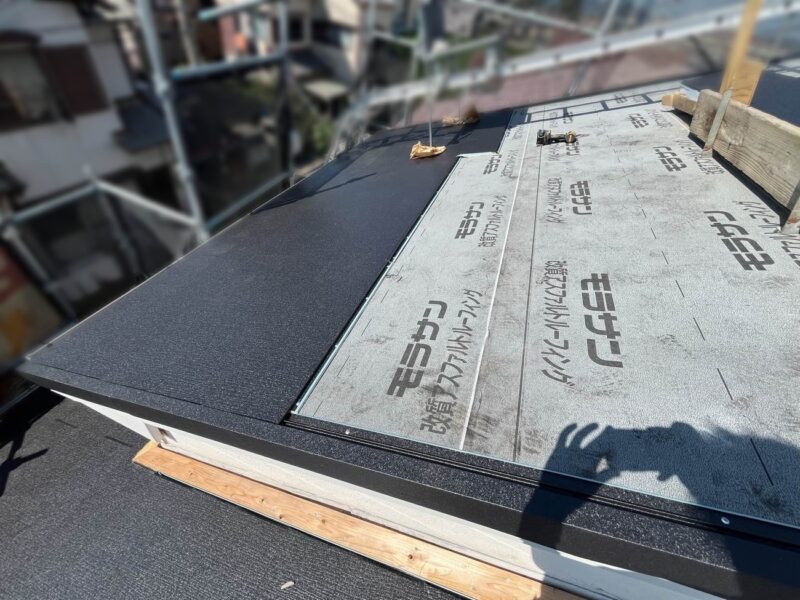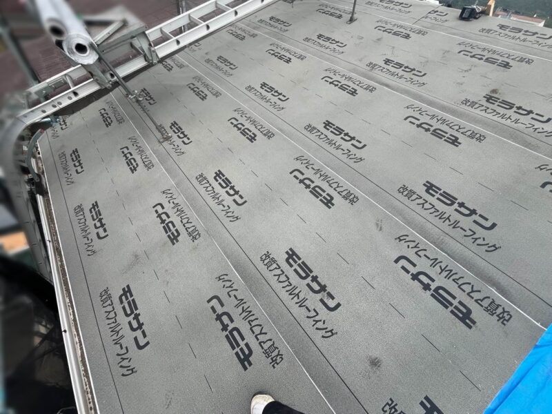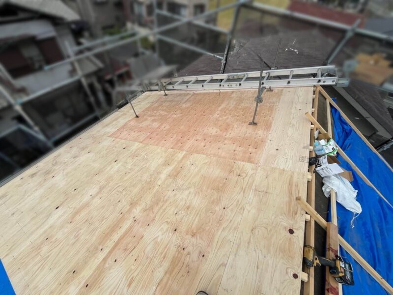 【ルーフィングシート張り】二次防水のためシートを張ります。
