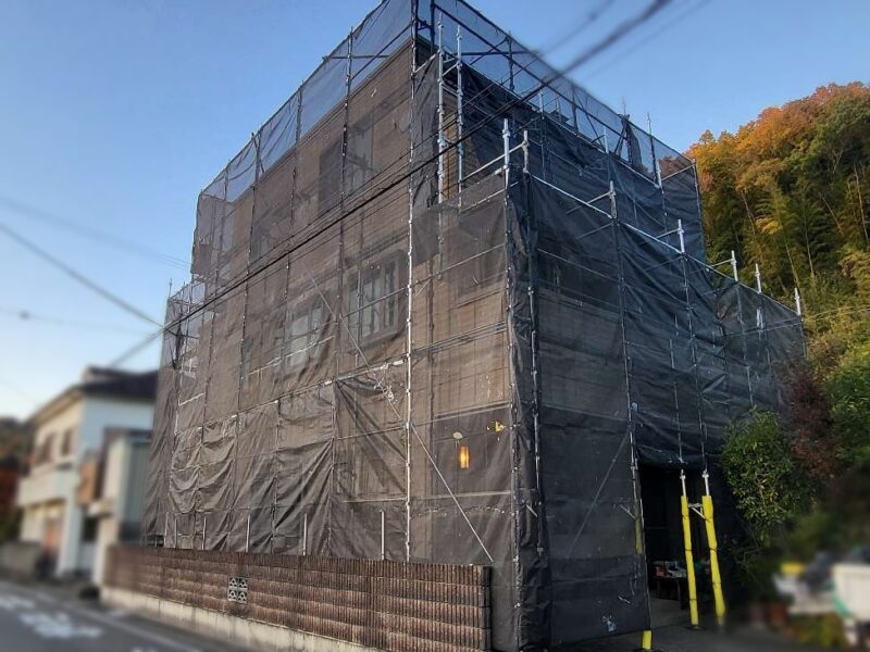 【足場】職人の安全、施工の効率、飛散防止の為足場を設置します。