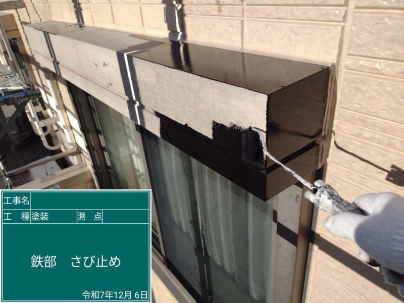 【シャッターボックス】下塗りです。鉄部分の下塗りは錆止め塗装をします。
