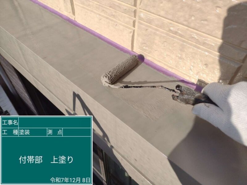【上塗り】中塗りと同じ塗料で仕上げていきます。狭い隙間などは、小さいローラーや刷毛が入る部分は塗装していきます。外壁はこれで完了です。