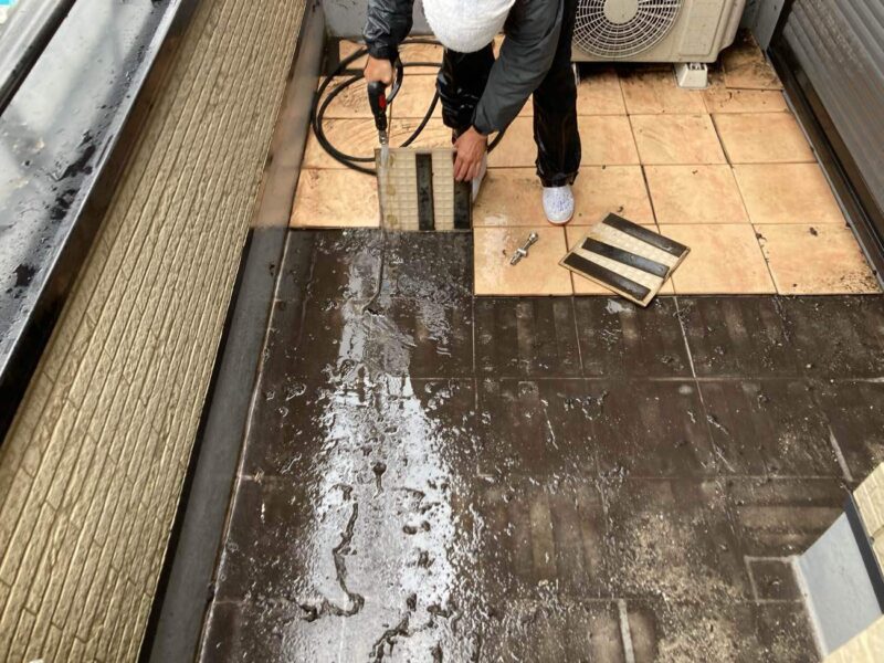 【ベランダタイル取外し】まずタイルを取り外します。